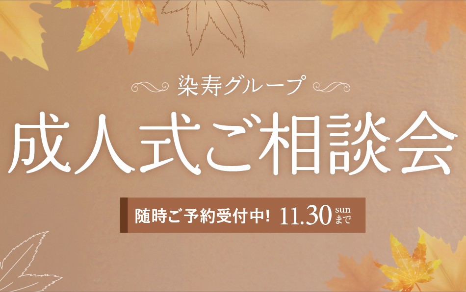 染寿グループ各店では11月30日(日)まで 「成人式ご相談会」 を開催します! 一生に一度の成人式。・成人式当日のヘアメイク、着付けはどこで何時から?・前撮りについて詳しく知りたい!・家にある振袖を来たい!などなど……分からないことはなんでもご相談ください! 開催店舗:染寿グループ各店開催期間:11…