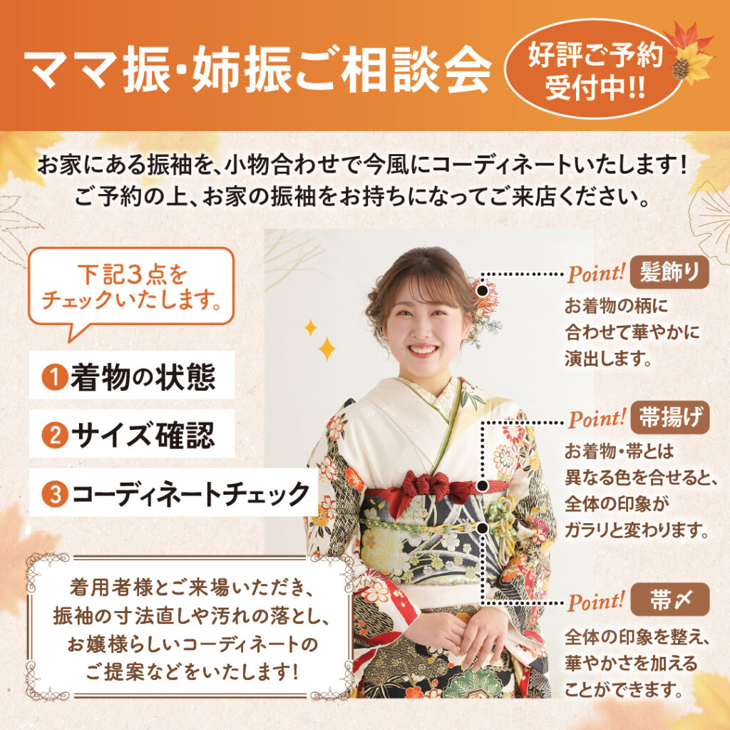 ご予約の上、ご家庭の振袖をお持ちになってご来店ください。